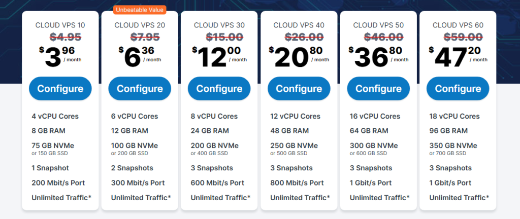 The cheapest option is the Cloud VPS 10, priced at $3.96–$4.95/month. It comes with 4 vCPU cores, 8 GB RAM, 75 GB NVMe or 150 GB SSD, 1 snapshot, 200 Mbit/s port, and unlimited traffic.